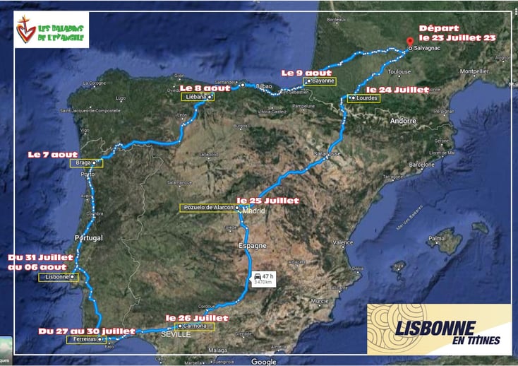 Nous connaissons les grandes lignes de notre parcours, Salvagnac -> Lourdes -> Madrid -> Séville -> Fereiras -> Lisbonne -> Fatima -> le nord de l’Espagne -> Bayonne -> Salvagnac