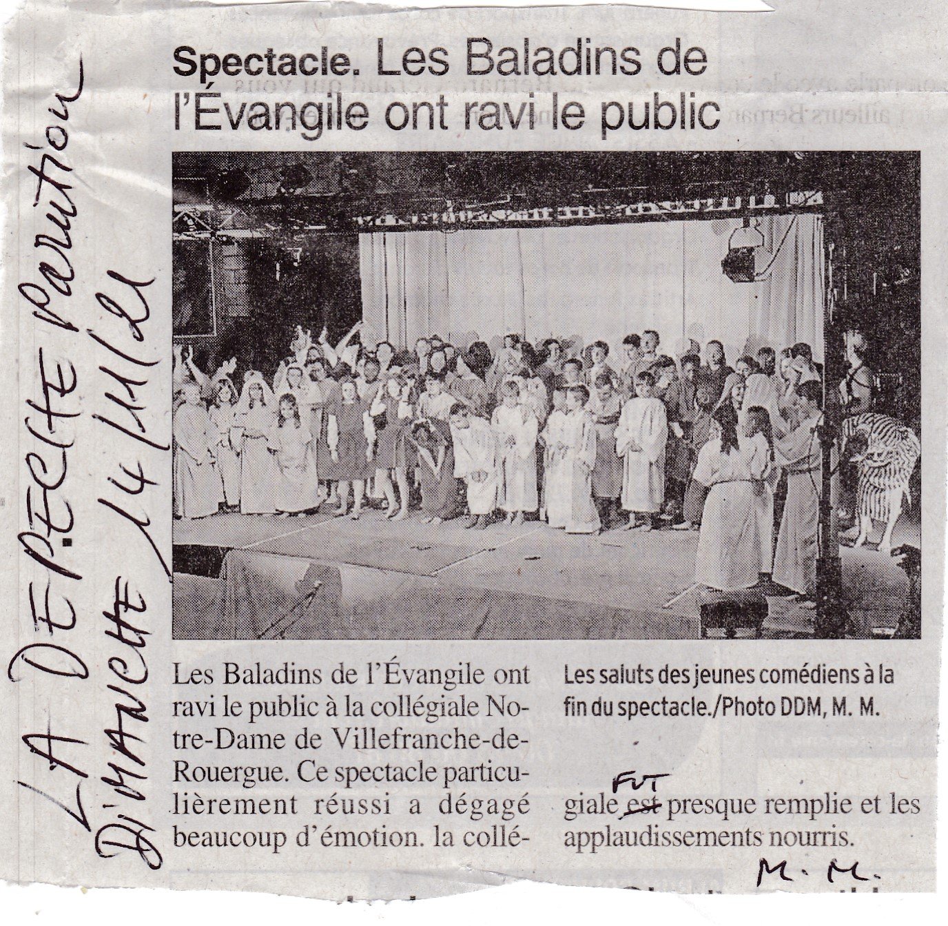De jeunes acteurs de la région de Villefranche-de-Rouergue, âgés de 10 à 40 ans, (photos ci-dessous) se produiront bientôt dans la collégiale sur une musique de Daniel Facérias. Le narrateur enregistré ne sera autre que le célèbre acteur, récemment décédé, Michaël Lonsdale. "Les Baladins de l’Evangile" sillonnent la France et certaines villes en Europe afin de présenter leur spectacle sur le thème de "La représentation de la vie de Jésus-Christ". L’originalité de ce spectacle tient dans le fait que les Baladins mettent à disposition leurs compétences techniques (matériel, son, lumières, costumes, accessoires), auxquelles s’ajoutent leurs compétences artistiques. Ainsi, ils aident des jeunes à être acteurs en play-back et gestuelle sur la bande-son de la représentation. Une originalité qui permet une belle découverte pour certains et l’éclosion de talents cachés pour d’autres.